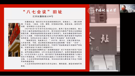 2022年11月30日中午12时30分,于腾讯会议线上召开了艺术党课分享活动。党支部赵苗淼、王迎春同志以《重温历史建筑中的辉煌党史——汲取前进力量 牢记初心使命》为主题,将学科专业知识与艺术党课相结合,通过“PPT讲述+实践活动构想”的方式带领大家共同重忆了武汉的红色足迹,选择武汉市的20处红色建筑,重温那一段段峥嵘岁月,回顾党一路走过的艰难历程,跟随历史的脉络将红色故事娓娓道来,深刻领悟党史精神。