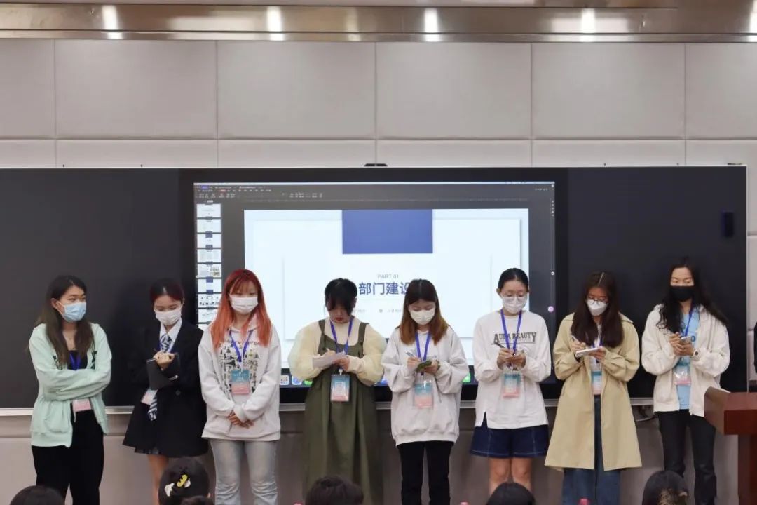 第二个答辩部门为秘书部,首先叙述了部门内部建设,而后展示了部门的日常工作,总结了部门应改进的不足之处,例如工作分配应当更细化,成员之间展开更多的经验分享等。
